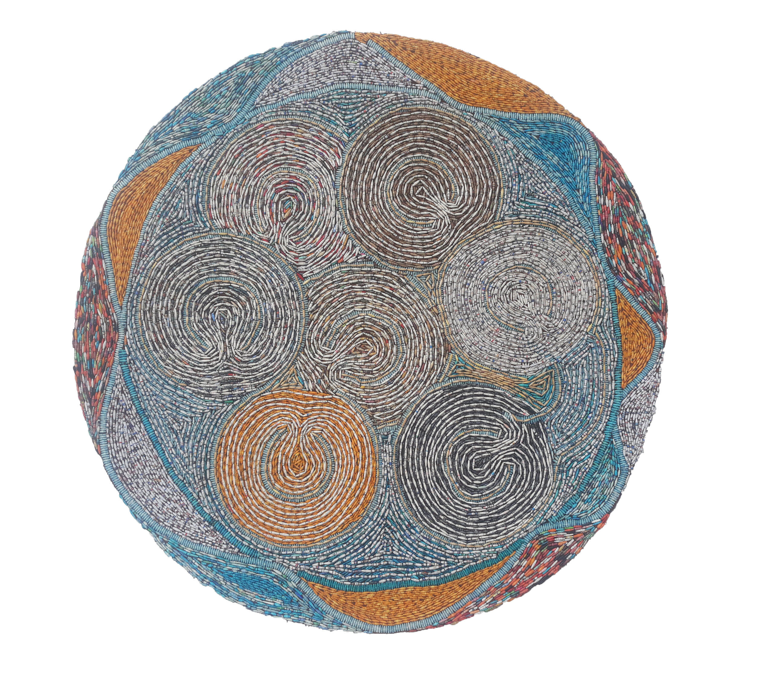 « portraits » à grande échelle, créés avec une extrême précision en pointant des clous de différents calibres dans du bois mort taché de café et de terre. Les clous sont ensuite ornés de feuille d’or.